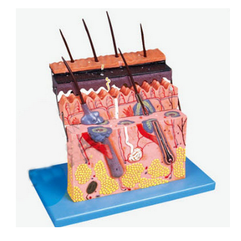 GD/A41001皮膚層次切面放大模型產品介紹:1、該模型由表皮和真皮各分兩部分共4個部件組成,借皮下組織與深層組織相連,并顯示表皮、真皮組織層次結構以及皮下組織和皮膚附屬器(包括毛、皮脂腺、汗腺和神...
